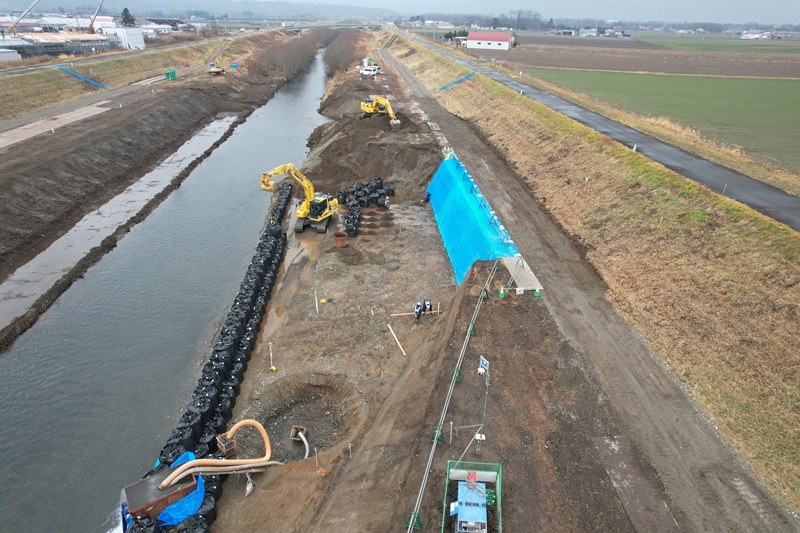 | 工事概要 | 【川西第1樋門地区】 工事延長 L=35m ・掘削工 V=2,400m3 ・盛土工 V=240m3 ・広幅鋼矢板(L=2m) N=19枚 ・コンクリート V=92m3 ・鉄筋 W=5t ・構造物取壊し工 N=1式 ・大型連節ブロック(360kg/m2) A=1,250m2 ・大型連節ブロック(320kg/m2) A=310m2 【途別築堤地区】 工事延長 L=120m ・掘削工 V=13,100m3 ・かごマット工 A=600m2 |