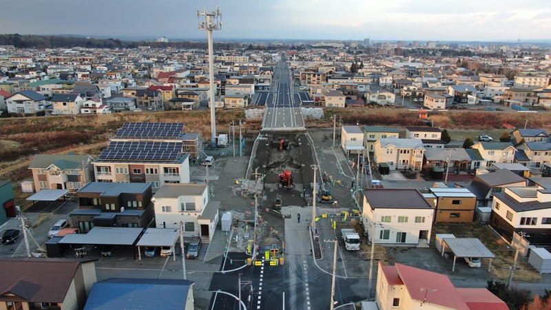 | 工事概要 | 工事延長 L=209m 幅員 W=18~33m ・既製杭工(PHC杭) N=8本 ・プレキャスト擁壁工 L=104m ・車道舗装 A=2,778m2 ・歩道舗装 A=763m2 ・河川土工、法覆護岸工、道路土工、地盤改良工、法面工、擁壁工、排水構造物工、 構造物撤去工、縁石工、踏掛版工、防護柵工、区画線工、道路付属施設工 各1式 |