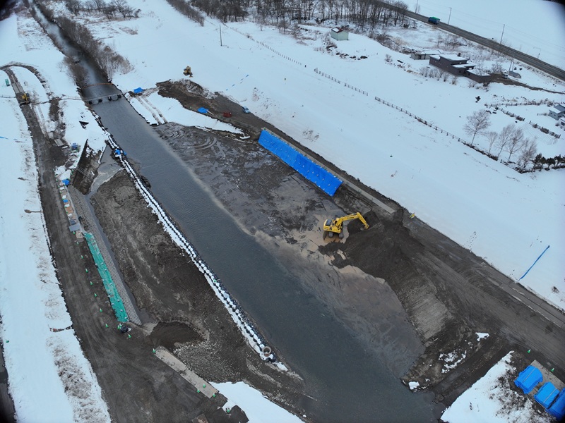 | 工事概要 | 【川西第1樋門地区】 工事延長 L=35m ・掘削工 V=2,400m3 ・盛土工 V=240m3 ・広幅鋼矢板(L=2m) N=19枚 ・コンクリート V=92m3 ・鉄筋 W=5t ・構造物取壊し工 N=1式 ・大型連節ブロック(360kg/m2) A=1,250m2 ・大型連節ブロック(320kg/m2) A=310m2 【途別築堤地区】 工事延長 L=120m ・掘削工 V=13,100m3 ・かごマット工 A=600m2 |
