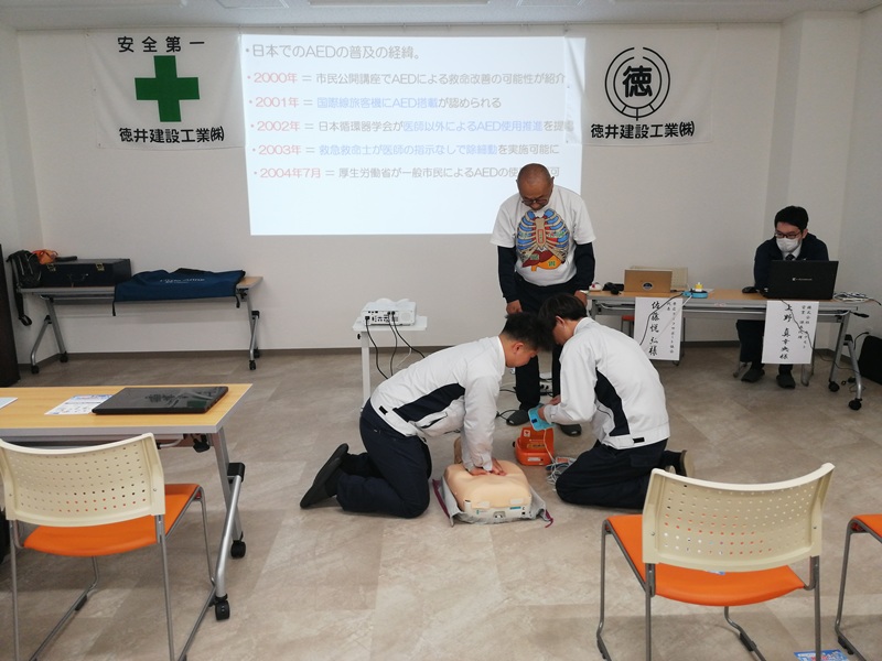 また、第2部では当社会議室に会場を移して当社職員のみが参加し外部講師として、帯広ライフサポート協会代表・佐藤悦弘様、カナモト営業課長代理・上野真幸央様による、災害時における安全対策(AEDの使用実演)や機械取扱及び修理事例の講話をいただきました。