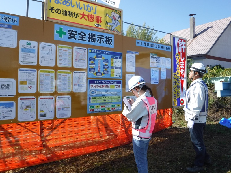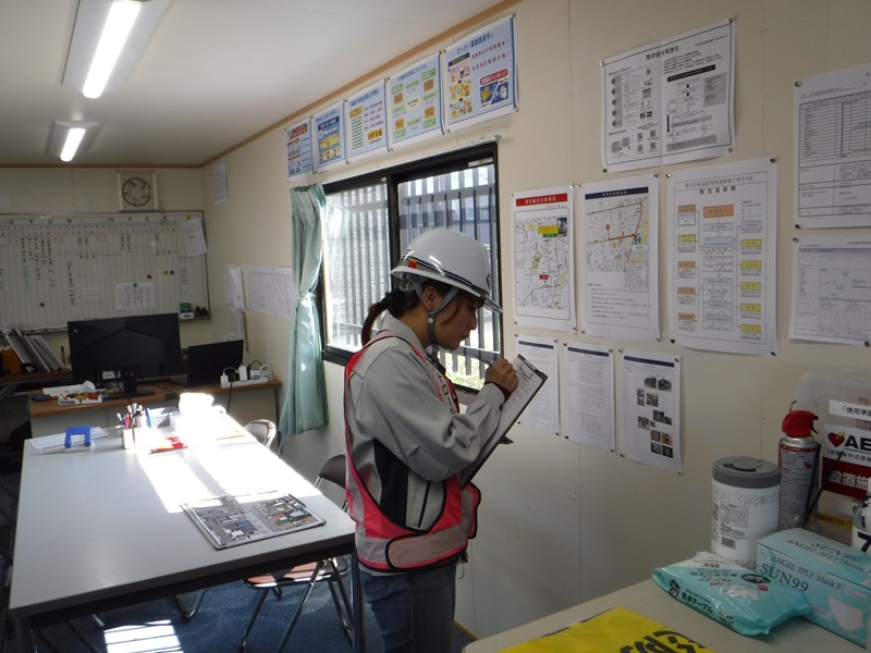 丸1日かけて各現場を巡回し、現場事務所では主に衛生面(ごみの分別、分煙状況、トイレなど)でのチェックに目を光らせ、施工現場では安全面や作業環境の実情を確認しました。従来とは違った目線のパトロール内容を各現場にフィードバックすることで、快適な環境で現場が運営できるのではないかと思います。