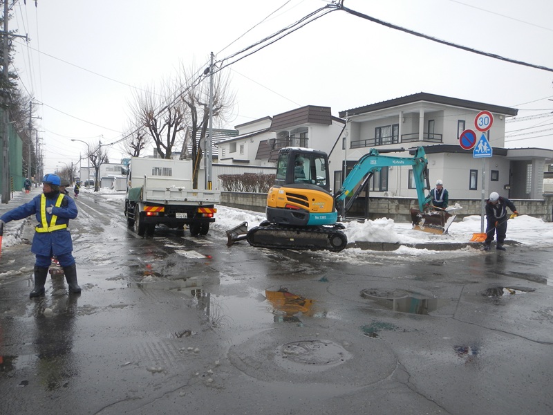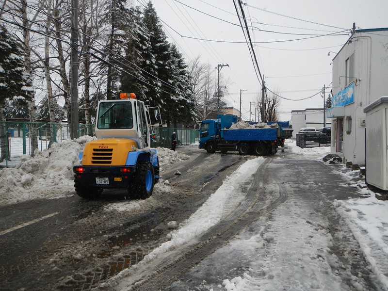 <New!> 帯広市立第五中学校の除排雪作業を行いました 2月28日(土)、地域貢献の一環として帯広市立第五中学校周辺道路において、通学歩道の除排雪作業をおこないました。 この日は前日晩から湿った雪が降り出し、当日作業中も小雪やみぞれが降る中、タイヤショベル2台、バックホウ1台、4tダンプ2台、10tダンプ2台を動員し、縁の部分は人力で歩道の雪山を取り除き、生徒さんの登下校および周辺住民の皆さんの歩行が安全にできるよう丁寧に除排雪作業しました。